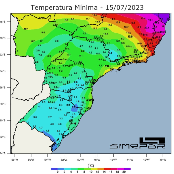 A temperatura mínima do Estado está registrada em General Carneiro -0,8°C, seguida por São Mateus do Sul 0,4°C e Francisco Beltrão com 0,9°C.