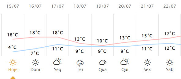 A máxima para Curitiba e RMC hoje é de 16°C. Para amanhã (16), a mínima será de 7°C e máxima de 18°C, segundo a previsão.