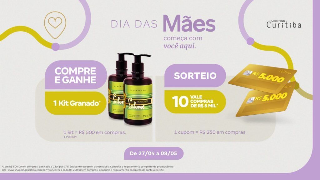 Além disso, o Shopping Curitiba irá sortear 10 vales-compra no valor de R$ 5.000 cada, exclusivos para serem utilizados com a Assistente de Compras. A cada R$ 250 em compras, o cliente ganha um cupom para concorrer ao prêmio. A campanha vai até o dia 8 de maio, e os sorteios acontecerão no dia 9 de maio.