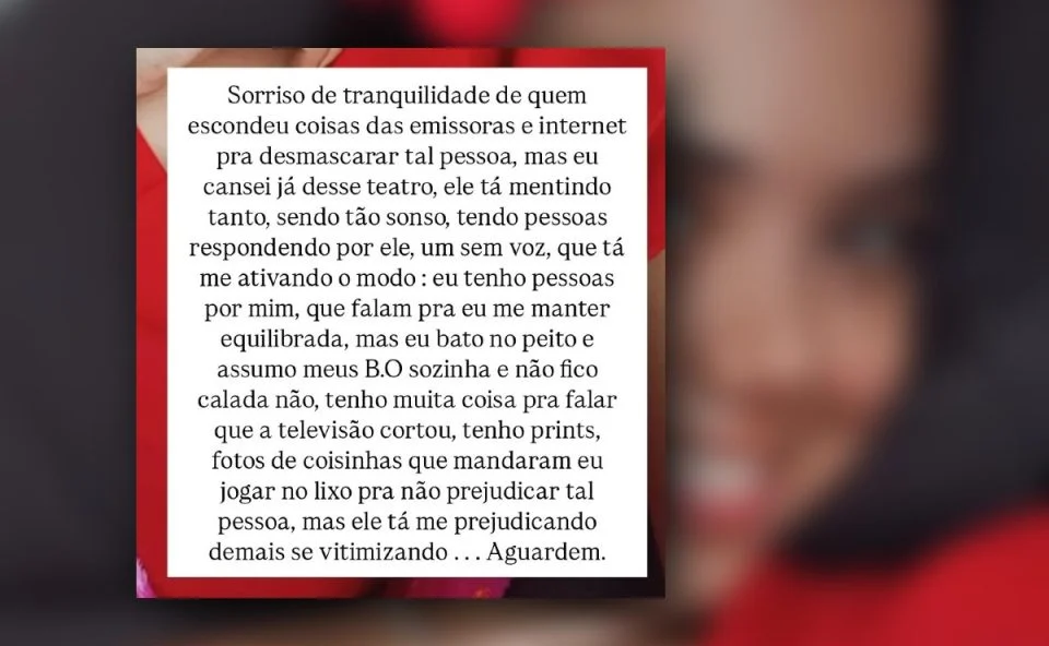 “Sorriso de tranquilidade de quem escondeu coisas das emissoras e internet pra desmascarar tal pessoa, mas eu cansei já desse teatro. Ele tá mentindo tanto, sendo tão sonso, tendo pessoas respondendo por ele… eu tenho muita coisa pra falar que a televisão cortou, tenho prints, fotos de coisinhas que mandaram eu jogar no lixo pra não prejudicar tal pessoa, mas ele tá me prejudicando demais se vitimizando… Aguardem”, escreveu.