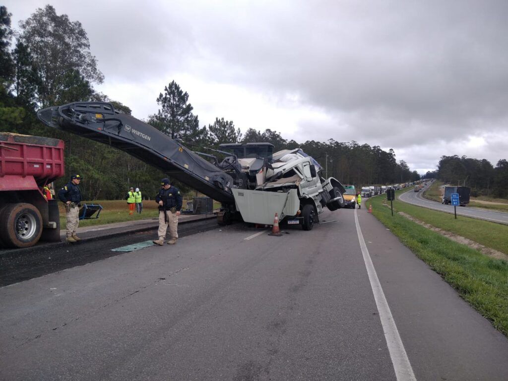 “Após perder o controle do conjunto, o semireboque trafegou para a esquerda, sobre grama do canteiro central, momento em que o condutor tentou corrigir o volante da saída de pista, ocorrendo efeito chicote, lançando o conjunto para a pista da direita, que encontrava-se fechada para obras de nova pavimentação, local aonde máquinas”, informou a PRF.
