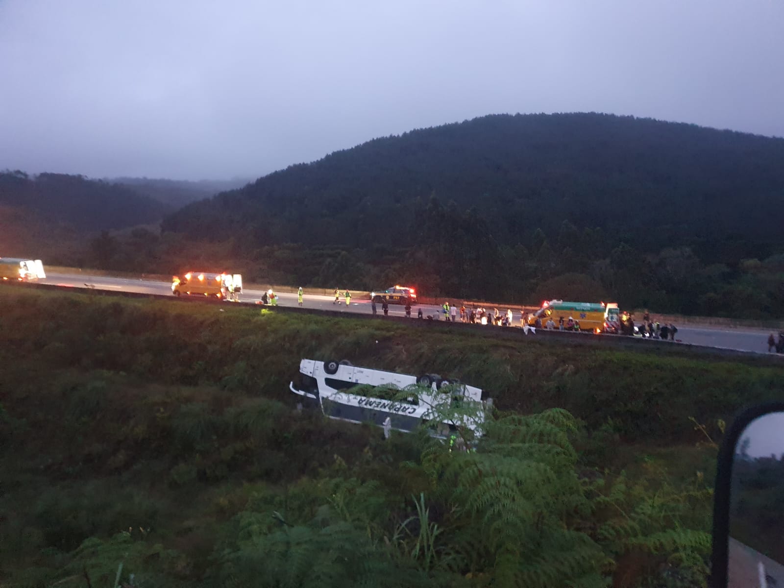 Na madrugada desta segunda-feira (25), a Arteris Régis Bittencourt registrou acidente envolvendo um tombamento de um ônibus de passageiros no km 30,8 da BR-116/PR, em Campina Grande do Sul. Há uma vítima fatal confirmada até o momento.