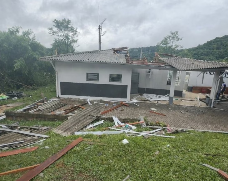 A Escola Municipal José Chesini sofreu destelhamento quase total e alagamentos internos, informa a prefeitura. “A limpeza e a colocação de lonas já estão em andamento. Ninguém estava no prédio durante o temporal e não houve feridos.”