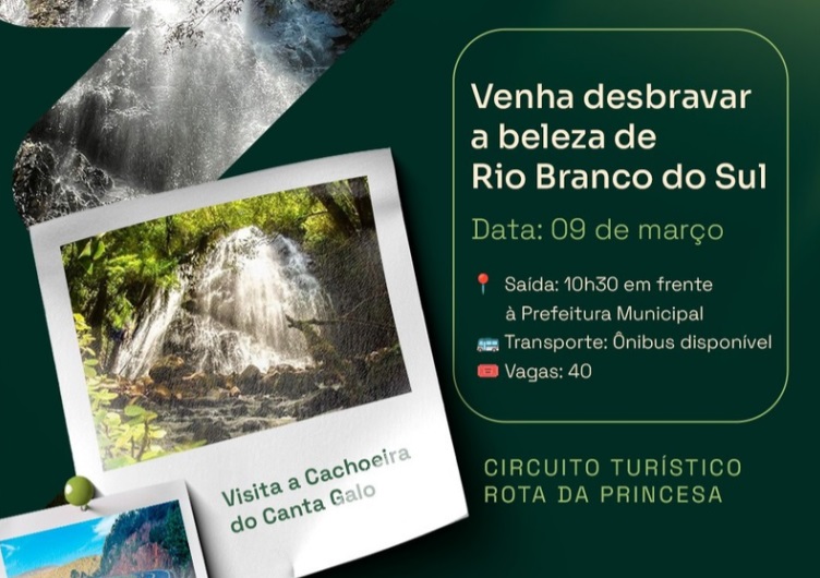 O Departamento de Turismo de Rio Branco do Sul promove, no dia 9 de março (domingo), um passeio especial pelo Circuito Turístico Rota da Princesa, levando os participantes a um roteiro repleto de natureza, cultura e belas paisagens. Com vagas limitadas a 40 participantes, o passeio terá transporte gratuito e sairá às 10h30, em frente à Prefeitura Municipal.