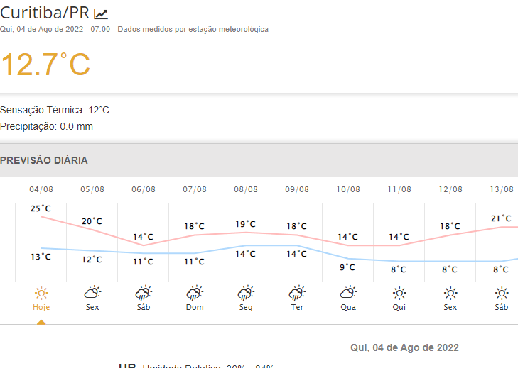 Curitiba deve viver nesta quinta-feira (4) o último dia do ‘veranico’, que tem sido rotina em vários dias das últimas semanas. A partir de sexta-feira (5), uma instabilidade avança e só deve fazer mais de 20°C na capital em pelo menos dez dias, conforme o Sistema Meteorológico Simepar. (veja previsão detalhada abaixo)
