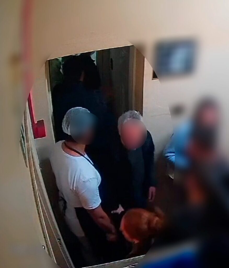 A partir desse momento, começa uma grande aglomeração no local e o homem grisalho de jaqueta preta, que tinha entrado praticamente junto com o policial, sai de dentro do banheiro. Ao lado de fora, uma mulher, de cabelo ruivo preso, o espera acenando com as mãos.