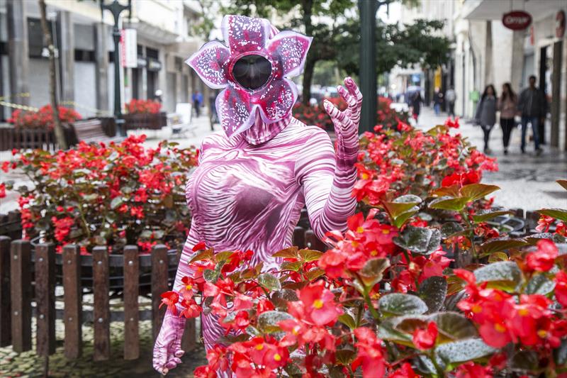 Criatividade foi o que não faltou aos integrantes do bloco. Mayara Mello, 34 anos, foi fantasiada de Demogorgon, personagem do seriado Stranger Things, uma criatura sem rosto, com uma enorme boca e uma espécie de flor no lugar da cabeça.