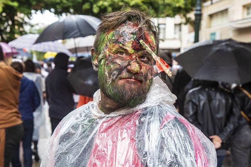 Daniele Pereira Buge, 44 anos, foi ao bloco vestida como o palhaço Art, do filme recém lançado Terrifier 2, personagem que é ressuscitado por uma entidade maligna. Ela compôs a fantasia com uma lente especial e a cabeça de uma boneca de borracha, maquiada com sangue artificial. “Comprei essa boneca há sete anos, em um brechó, e todos os anos penso em uma fantasia que ela possa ser minha acompanhante”, contou.
