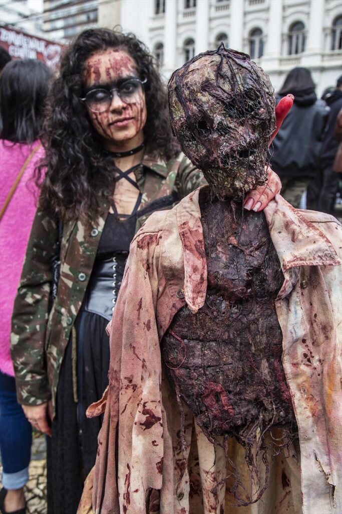 O pai de Bruna, Diego de Abreu, conta que a menina vai ao Zombie Walk desde que era bebê. Diego também participou do bloco fantasiado de Michael Myers, do filme Halloween Kills.